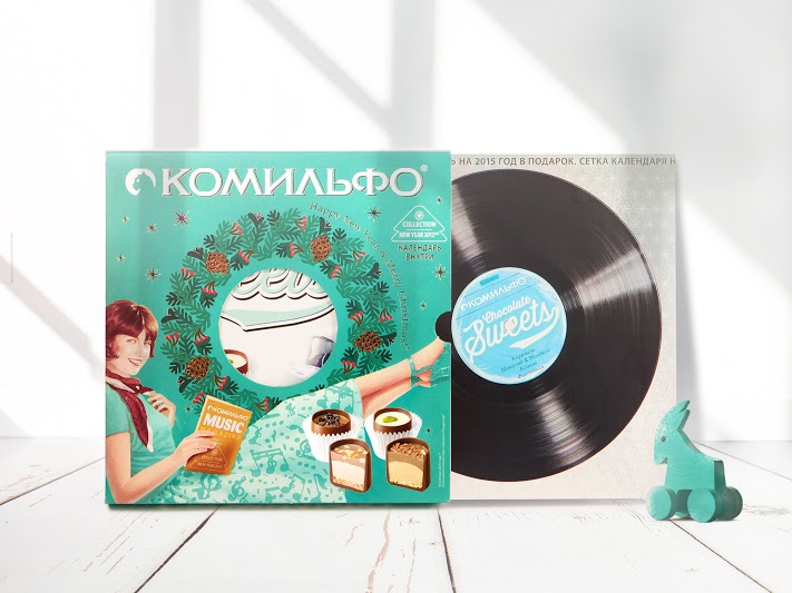 Каждая новая ограниченная серия «Комильфо» — это оригинальный артефакт в ретро-стилистике, выполненный с особым вниманием к деталям. В этом году коробка конфет превращается в обложку музыкальной пластинки — идеальный рождественский подарок 1950—1960-х годов.
