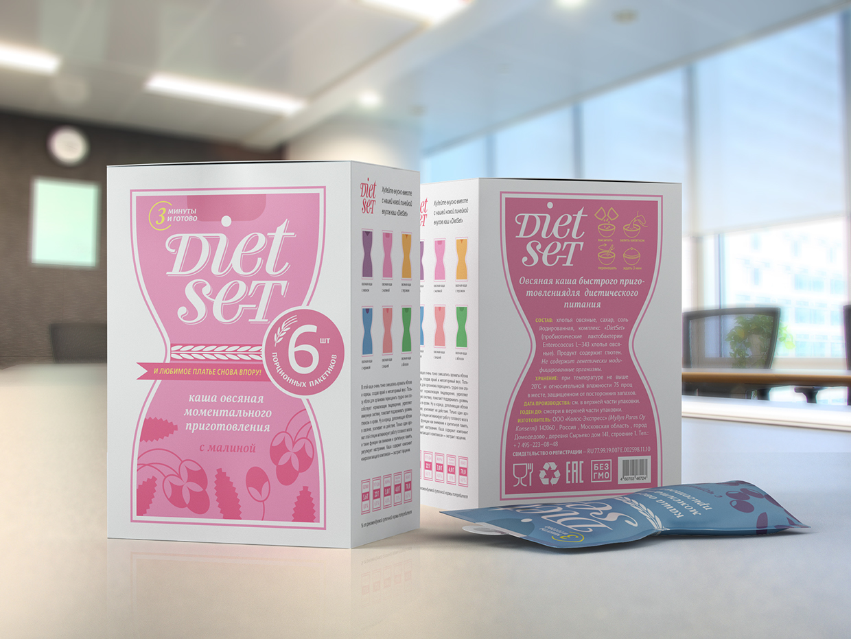 Коммуникация каш Diet Set, как продукта для похудения, достигается за счёт характерной формы пакета, у которого появилась талия. Пакет изготовлен из тонкого пластика. Печать на таком материале чёткая и яркая, что важно для воплощения данного дизайна.