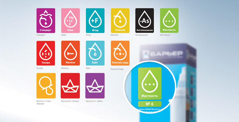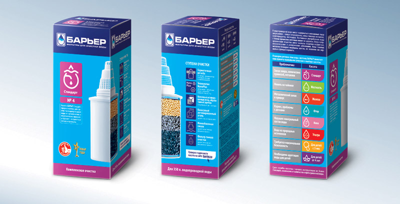 Продуктовая линейка БАРЬЕР очень разнообразна, и поэтому потребителю у полки важно быстро принять решение и выбрать кассету, подходящую именно для его типа воды. Исходя из этого, была тщательно продумана навигация и цветовая дифференциация продуктового ряда. Простая инфографика исчерпывающе рассказывает о технологиях фильтрации, видах и ресурсе сменных кассет, основных проблемах воды.