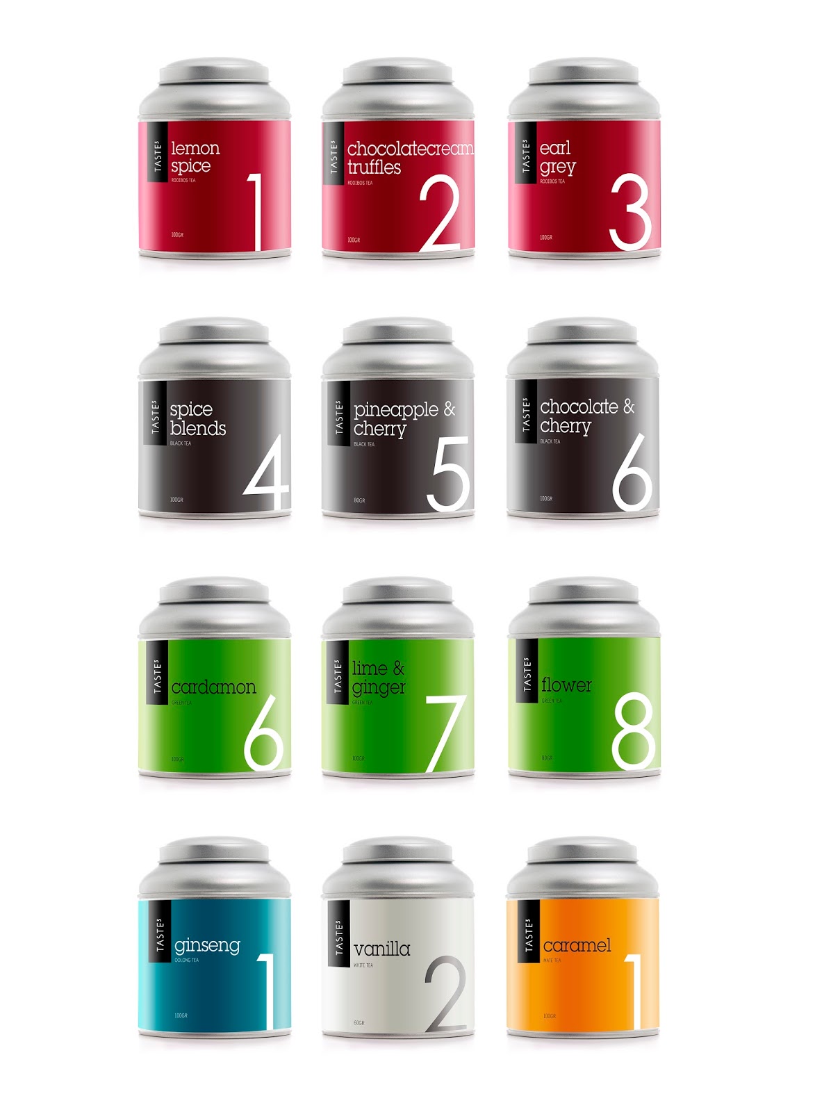 Бренд TASTE3 представляет собой концептуальный магазин, в котором представлены уникальные продовольственные товары. Дизайн коллекции чая навеян типографскими числами и чёткими цветами.