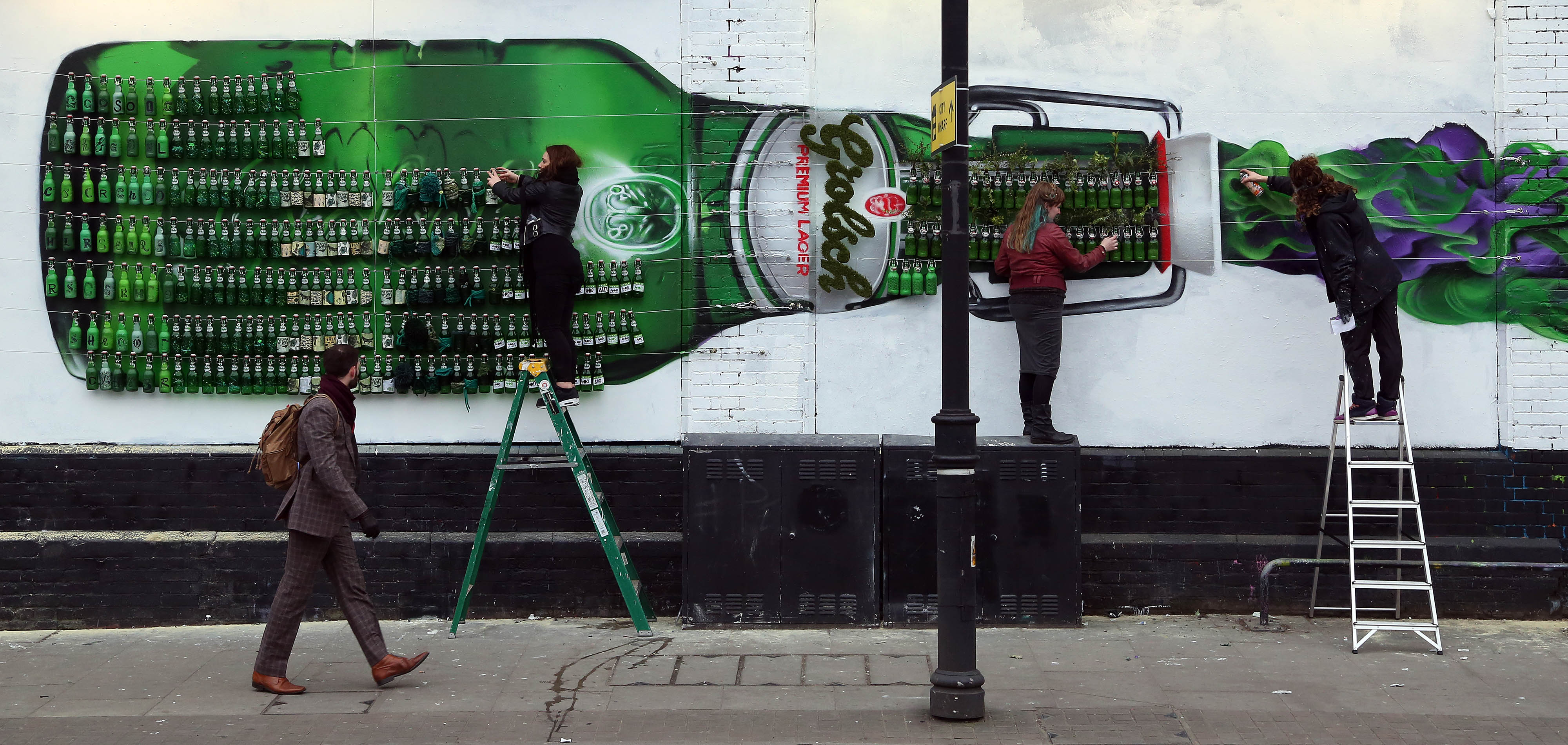 Команда дизайнеров подвесила 400 фирменных бутылок Gorlsch за 400 минут, украшая их с помощью разнообразных методов уличного искусства. Бутылки украшают большую стенную роспись, изображающую фирменную бутылку, пишет Upakovano.ru. Арт-объект появился в восточной части Лондона.