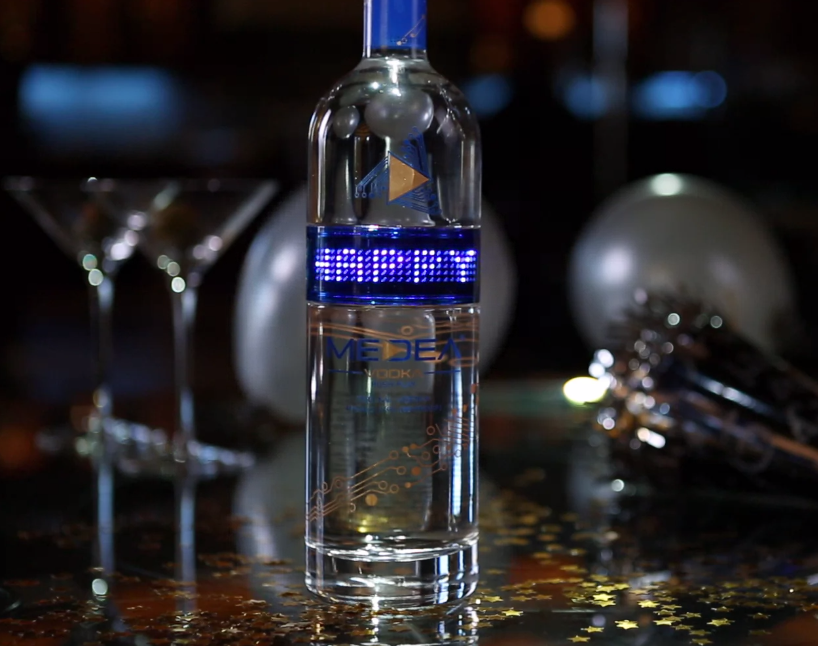 Голландский водочный бренд Medea Vodka выпустил необычную бутылку с программируемым светодиодным дисплеем вместо этикетки в 2010 году. Процесс программирования довольно простой, пишет Sostav.ru, а специальная функция сбережения энергии батарейки отключает дисплей после трех минут «прокрутки» сообщения.
