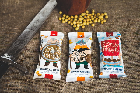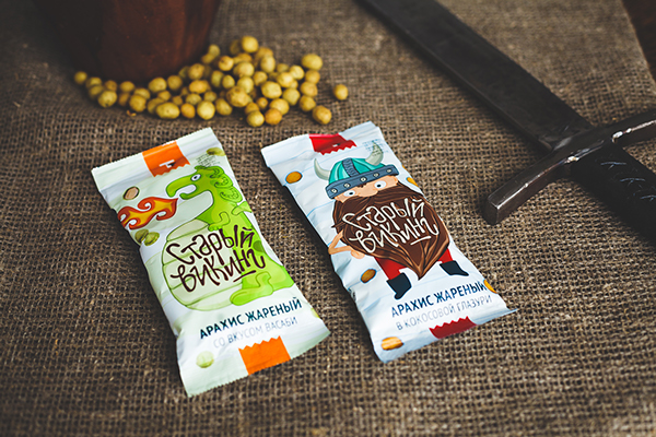 Идея упаковки состояла в том, чтобы каждый новый вид сопровождал новый персонаж, косвенно связанный со вкусовой добавкой ореха. Так, например, васаби — это огнедышащий дракон, а креветка — это корабль (драккар) с розовыми парусами (цвета креветки).