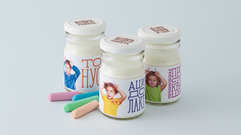 Креаторы разработали все этикетки продуктовой линейки «Козлят и ребят»: шесть для баночек и одну для молочной бутылки. Для каждого продукта была подобрана уникальная цветовая пара: одним цветом тонировалась одежду ребенка, а другим — логотип продукта.