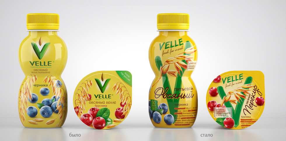 В рамках задачи по модернизации бренда и улучшению возможностей мерчандайзинга, команда обновила фирменный знак и айдентику марки. В основу концепции изменений легла идея позиционирования марки как партнера на пути к правильному питанию — бренд Velle отказался от предыдущего слогана «Гармония вкуса и пользы». Теперь марка позиционирует себя англоязычным слоганом Food for mood («еда для настроения») и фразой «Цените себя — питайтесь правильно».
