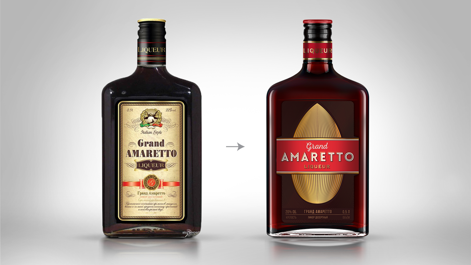 Работая над редизайном ликера «Grand Amaretto», дизайнеры хотели пересмотреть смыслы, которые обычно вкладываются в дизайн традиционных напитков. «Grand Amaretto» — продукт для масс-маркета, и мы хотели освежить его, сделать понятным и вызывающим доверие.