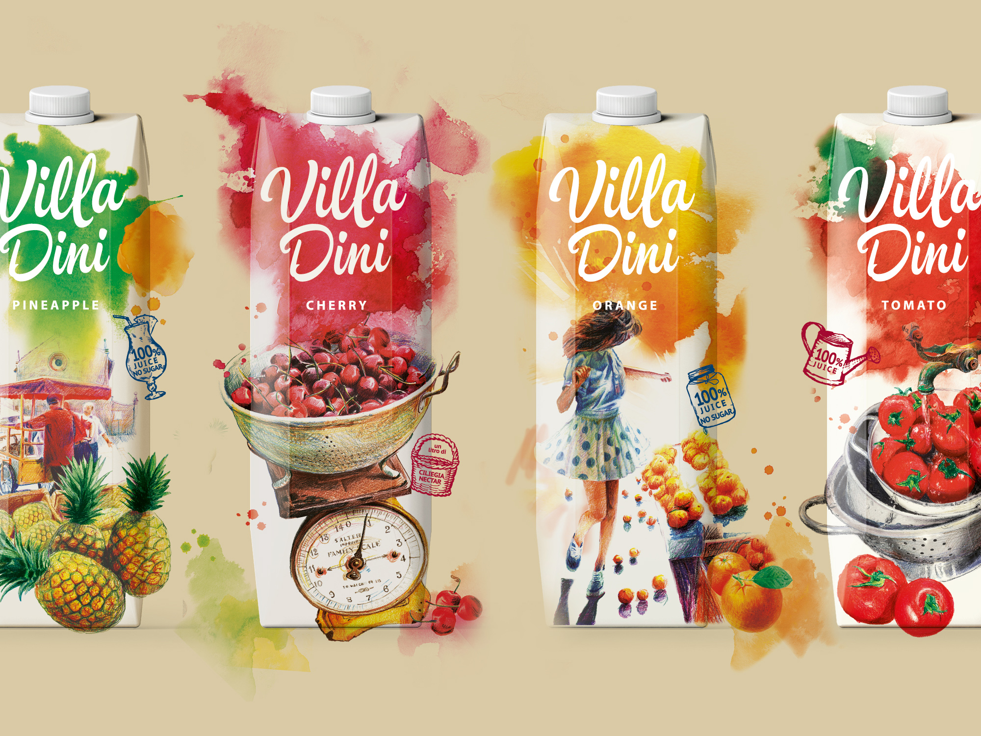 Продукция бренда Villa Dini уже появилась в продаже. В данный момент линейка представлена шестью SKU — это апельсиновый, яблочный, ананасовый, вишнёвый, томатный и гранатово-виноградный соки.