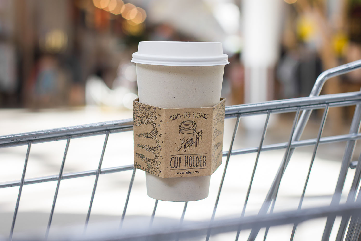 Дизайнер из Дани Марекс Мелекис (Mareks Melecis) из MarMel Studio придумал несложную упаковку, позволяющую держать стакан с горячим или холодным напитком прямо на тележке для покупок. У самого дизайнера маленький сын, поэтому он пьёт много кофе – каждый день и в любом удобном месте. Однако очень непросто делать покупки, одновременно держать стакан с кофе и присматривать за ребёнком. Чтобы облегчить жизнь таких же как он, дизайнер разработал складной держатель для стакана, который можно крепить к тележке для покупок.