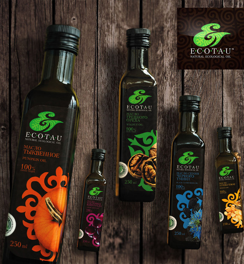 Задача: создать стильный дизайн, передающий национальный колорит, но избегая «экстремальной аутентичности». В процессе разработки креативная группа подобрала ряд национальных кыргызских узоров, которые нашли отражение фирменном стиле и упаковке. Каждое масло — свой вкус, свой узор. В лого стилистически сплетены две буквы Е[eco] и Т[tau — гора].