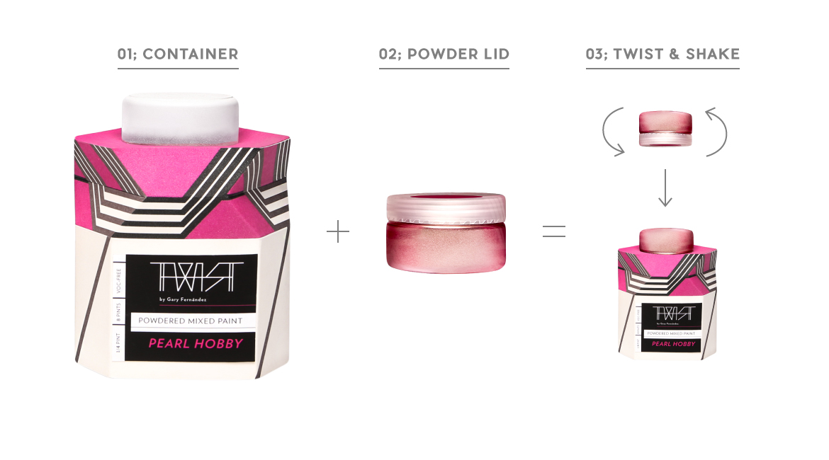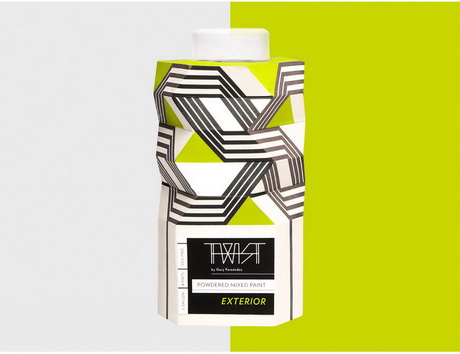 Этот проект интересен тем, что упаковка обладает особой конструкцией. Поворачивая крышку с порошком и встряхивая упаковку, чтобы смешать его с водой, потребитель получает готовую краску. Концепт достаточно экологичен, поскольку в дальнейшем можно менять только крышку с нужной краской.
