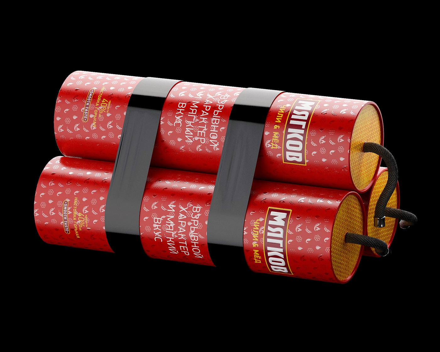 Брендинговое агентство FIRMA разработала лимитированную упаковку для настойки «Мягков. Чили и мед» (компания «Синергия»). При создании упаковки дизайнеры решили «взорвать полку», представив бутылку в виде динамитной шашки. Наливать продукт предлагается из «фитиля» — длинного шнурка с крышкой.