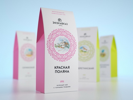 Кроме цветового кодирования, продуктовые линейки различаются степенью сложности: упаковки «моносборов» (зверобой, мята и т.д.) включают только орнаменты и шрифты, а для оформления упаковок купажей (травяные тизаны, зеленый и черный чай с добавками) использованы акварельные пейзажи с видами Кавказа. Эти иллюстрации клиент уже использовал ранее для оформления упаковок, поэтому идея сделать их элементом обновленного дизайна станет хорошим маркетинговым ходом и поможет сохранить коммуникацию с лояльной аудиторией потребителей.