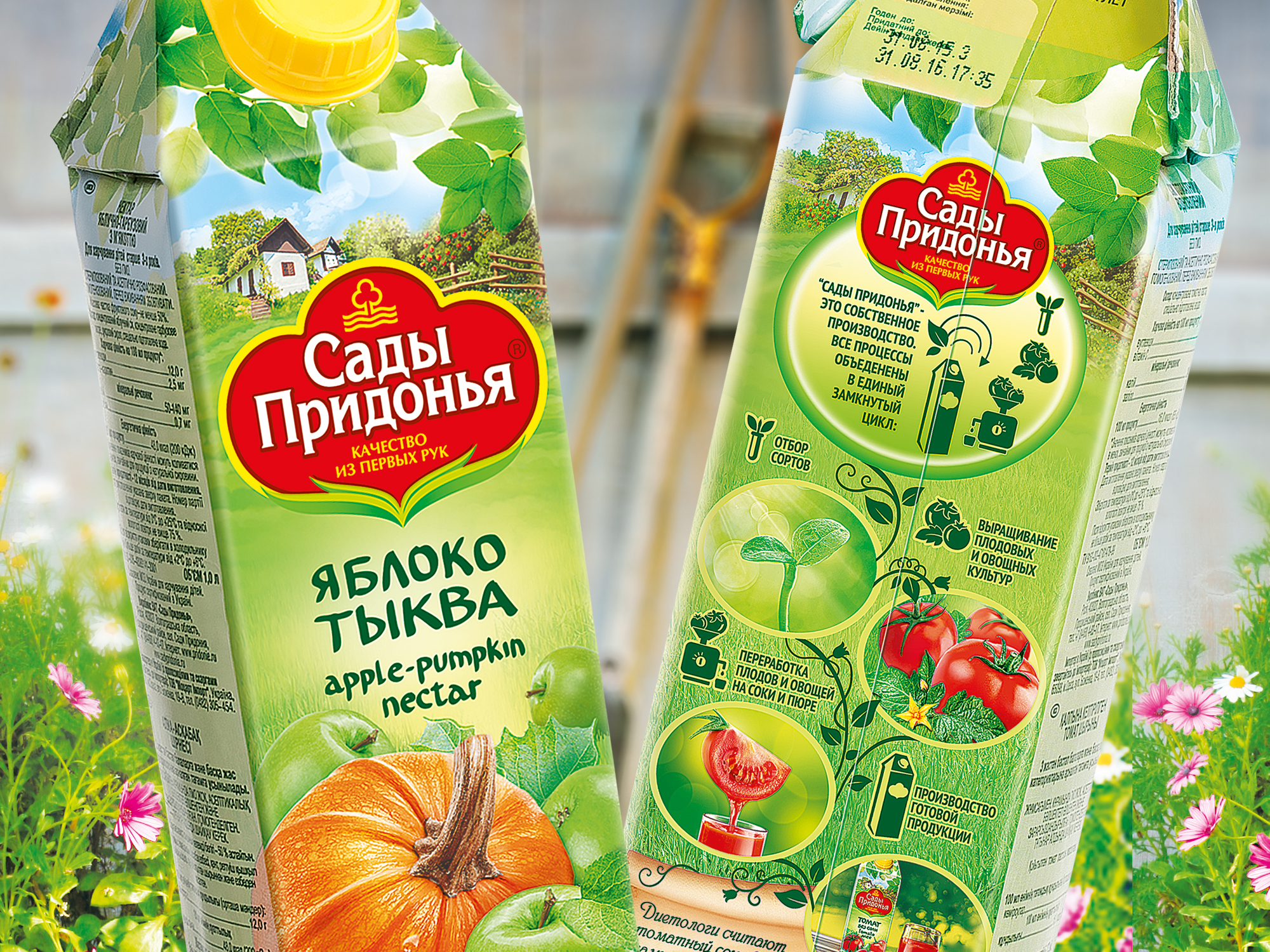 Все элементы обновленной упаковки, в том числе и оборотная её сторона, иллюстрируют главное конкурентное преимущество «Садов Придонья», выраженное в слогане «Качество из первых рук». Это замкнутый цикл производства от плодового семечка до продукта в пачке. С 1996 года компания развивает собственную сырьевую базу, учитывая природно-климатические условия, экологические факторы и постоянно меняющиеся требования рынка. В последние годы наряду с садоводством «Сады Придонья» активно развивают и овощеводство.