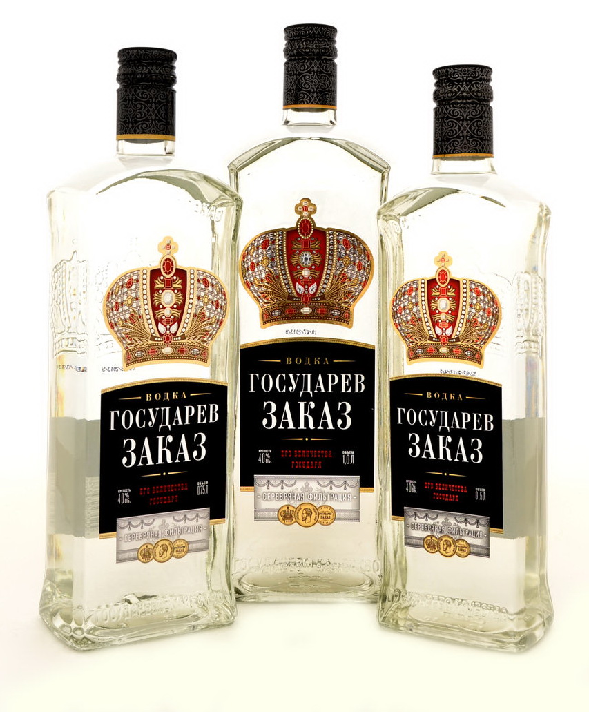 Весь дизайн «Государева заказа» связан с историей — бутылка по форме напоминает дореволюционный водочный штоф, этикетка с яркой, богатой, в драгоценных камнях короной Российской империи.
