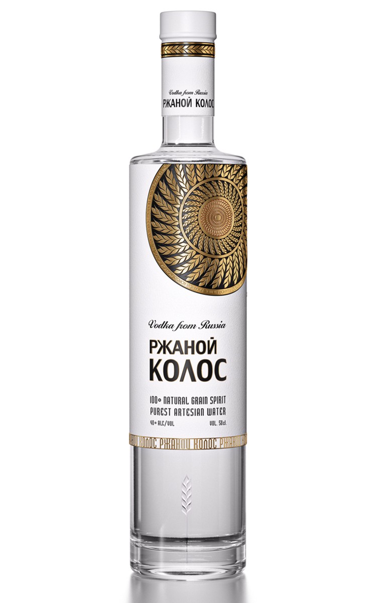 Ещё один интересный дизайн — водка особая «Ржаной колос». Есть люди, которым нравится оттенок вкуса, здесь он очевиден: колосья и изображены на бумаге, и выдавлены на стекле. В центре этикетки они сплетаются в золотое солнце, и этот благородный цвет намекает на «золотое» качество содержимого. А солнечная спираль сообщает радость, гипнотизирует.