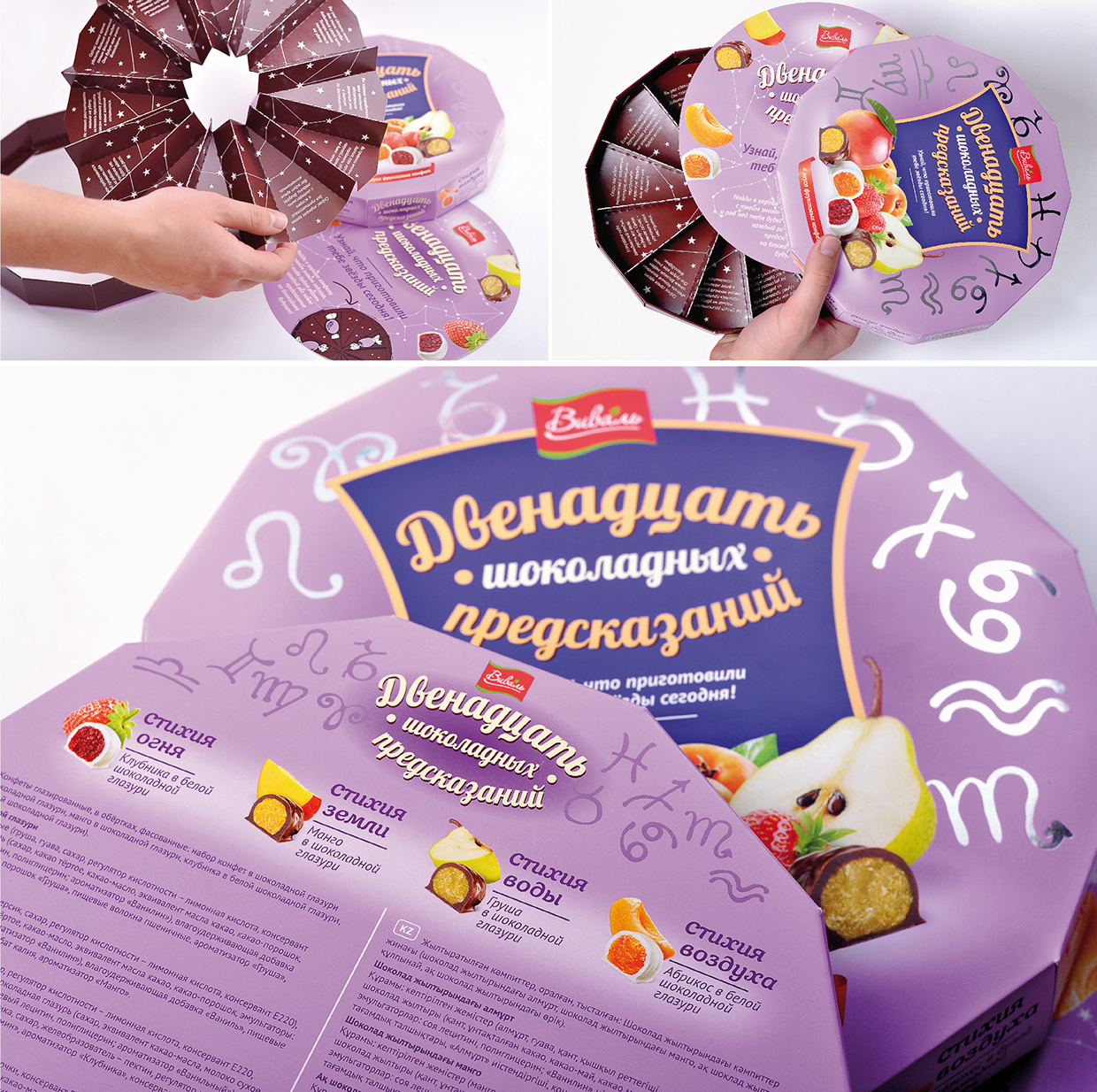Данную идею дизайнеры воплотили при помощи уникального, с одной стороны, и простого, с другой, конструктива коробки. Достать конфету со своим знаком зодиака из ячейки и прочитать предсказание. Всё просто! А если нужно обновить предсказания, то достаточно заменить только внутреннюю часть коробки.