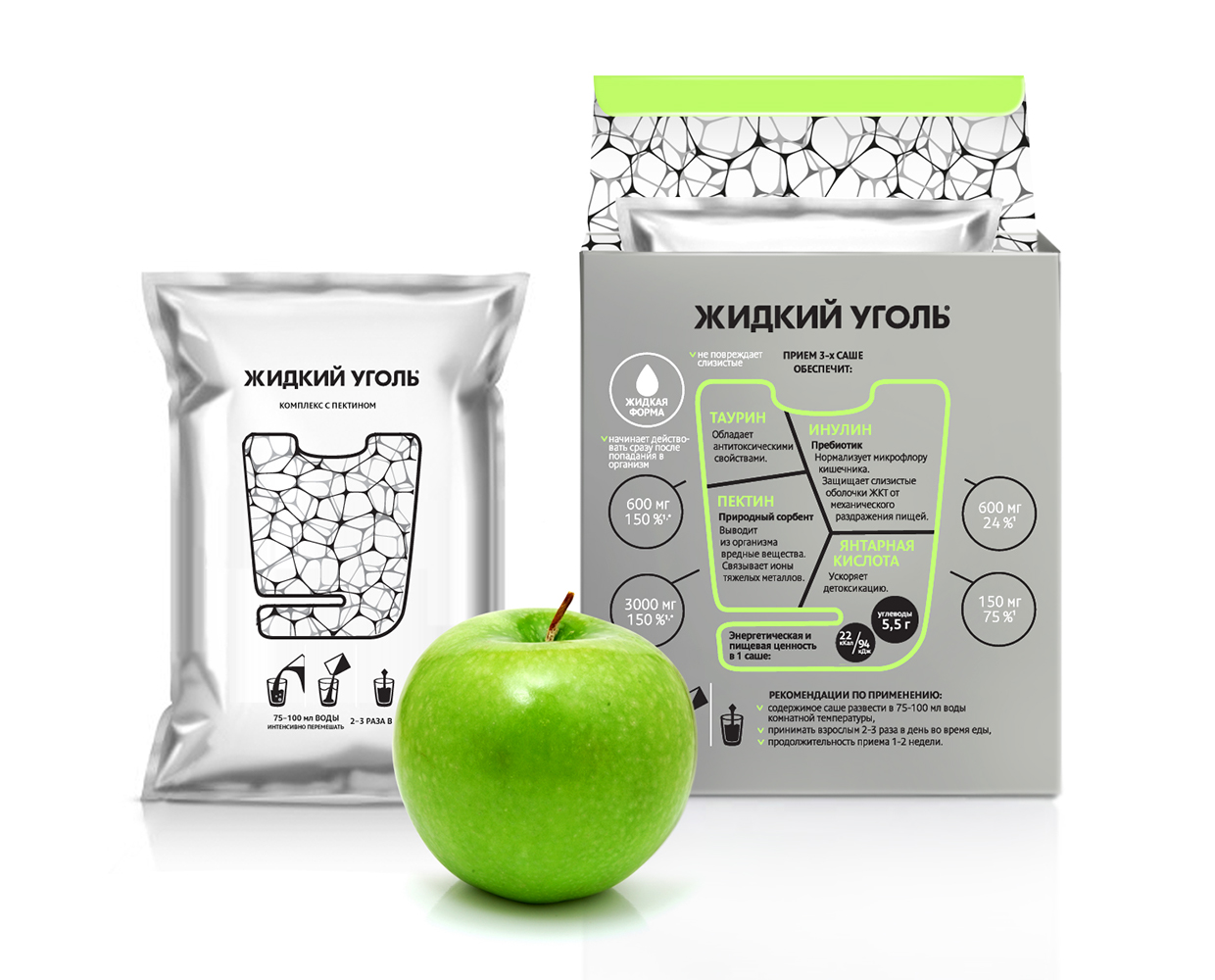 Перед ней стояла задача разработать упаковку для инновационного продукта фирмы «Аквион» на российском рынке фармацевтических препаратов — «Жидкий уголь» и «Жидкий уголь для детей». Необходимо подчеркнуть преимущества продукта: жидкая форма, действующее вещество —пектин.