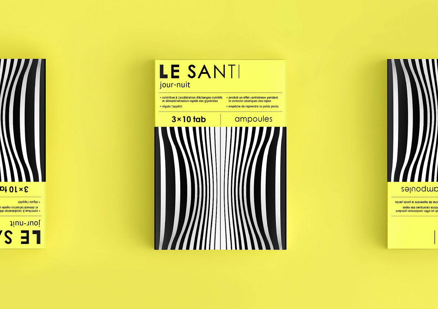 В итоге команда представила абстрактный визуальный образ с более конкретной базовой идеей. На каждой пачке препарата присутствует индивидуальный принт, содержащий оптические иллюзии. По словам авторов, его активность сбалансирована цветовыми блоками спокойных оттенков, что помогает передать и характер бренда, и его ценности.