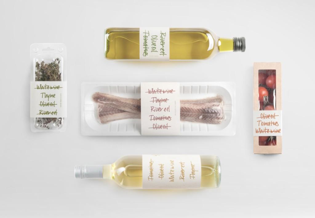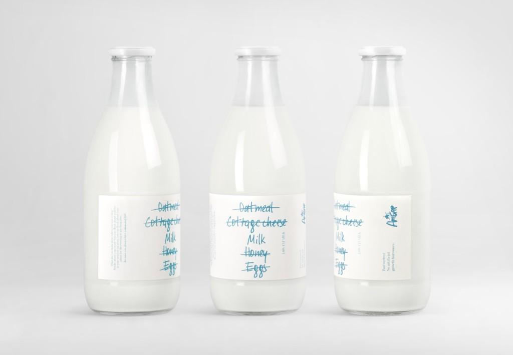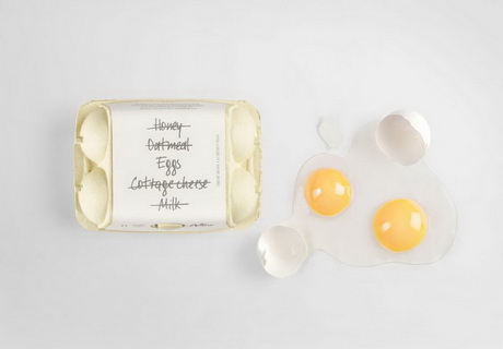 Российское брендинговое агентство Depot WPF разработало дизайн упаковок для товаров супермаркета «Амбар», позиционирующегося как магазин здоровых продуктов. На каждой упаковке расположена этикетка с названием того продукта, который находится в емкости («яйца», «помидоры», «оливковое масло»), а сверху и снизу указаны зачеркнутые наименования других товаров, традиционно употребляющихся вместе с ним. Таким образом, этикетки напоминают список необходимых покупок, который может облегчить потребителям поиски нужных ингредиентов.
