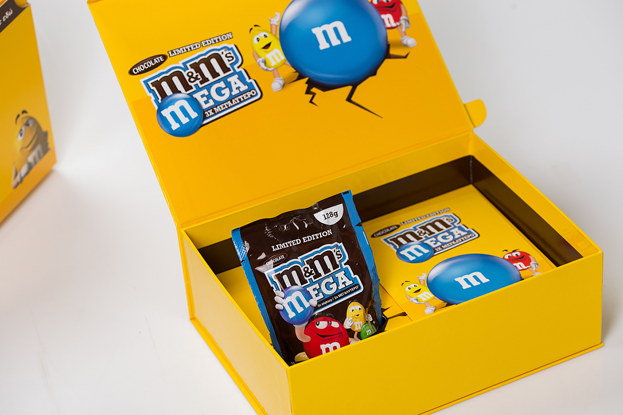 Бренд разноцветных конфет M&M’s вновь решил впечатлить своих фанатов, выпустив на рынок Греции промо-упаковку MEGA M&M’s. В состав упаковки входит пакетик с огромными конфетами M&M’s и рекламная брошюра. Уникальная коробка для подарочного набора оформлена соответственно. Потянув за специальный «рычаг», пользователь активирует сложный механизм, который в три раза увеличивает размер нарисованной конфеты.