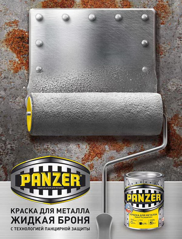 Краска для металла PANZER — это технологичный, серьезный продукт, гарантирующий 100% результат. Ее способность справляться с ржавчиной и защитить поверхность от разрушений подчеркивает весь маркетинг-микс, включая лаконичную профессиональную цветокодировку. Слоган: «жидкая броня для металла», весь копирайт и пиктограммы призваны убедить ЦА в эффективности продукта и правильности выбора.