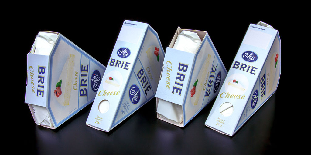В линейке было разработано два дизайна для сыров Brie и Camembert. Для сохранения общей стилистики было введено цветовое кодирование по вкусам. Большое внимание уделено созданию вкусной, минималистичной и говорящей фуд зоны.
