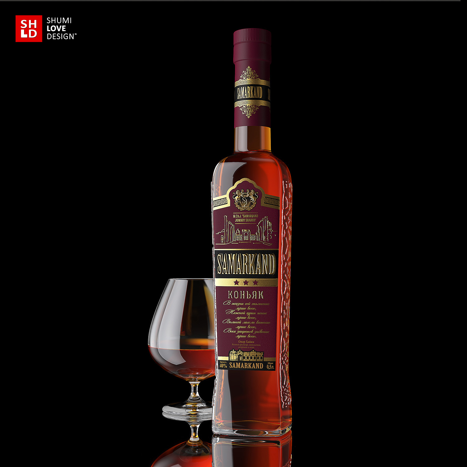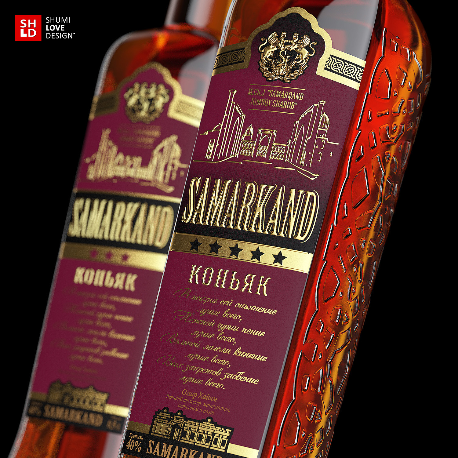 Разработанное агентством решение представляет собой обновленную упаковку известного узбекского коньяка, где были сохранены только основные элементы, обеспечивающие узнаваемость продукта, и полностью обновлена общая композиция этикетки. Главными графическими элементами выступают название продукта и стилизованное изображение главной достопримечательности Самарканда, выполненные с применением тиснения золотой фольгой.