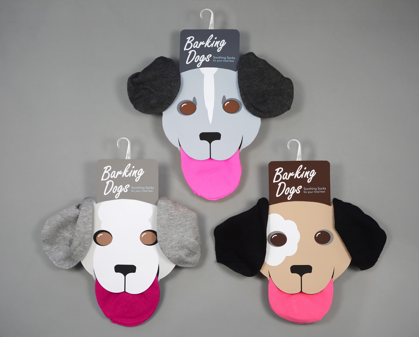 Упаковка носков Barking Dogs выполнена в форме собачьих мордочек, пишет Upakovano.ru, что обеспечивает заметность продукта на прилавке любого магазина.