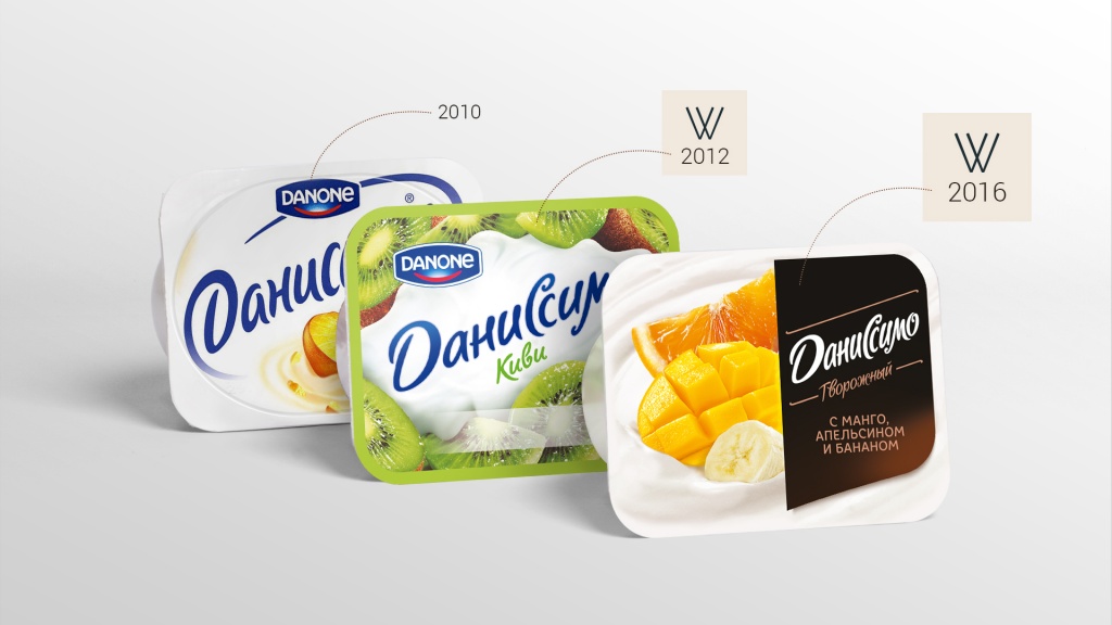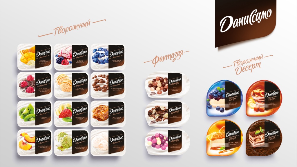 В ходе работ был создан единый дизайн для всех трёх линеек бренда «Даниссимо» (Классические, Двухслойные десерты и Фантазия), всего 21 продукт.