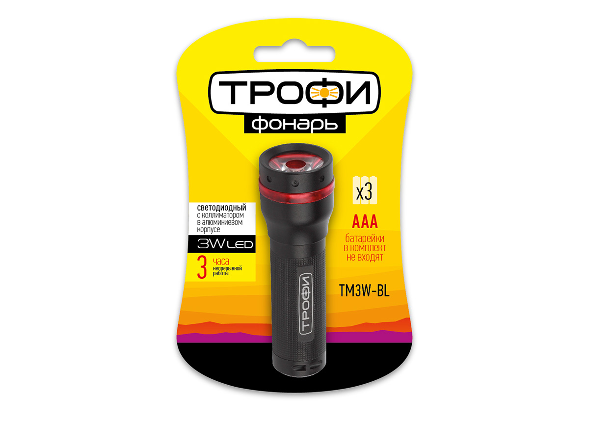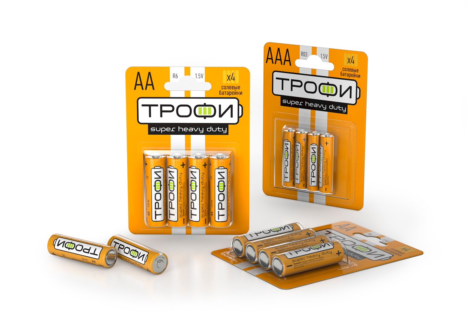 ТРОФИ — марка, под которой производятся батарейки и фонари. Владимир Шмойлов разработал новую айдентику и дизайн упаковки. Динамическая айдентика лого — буквы названия торговой марки на батарейках вписаны в абрис классического элемента питания, в то время, как в логотипе фонаря используется эллипсообразный абрис. Здесь эллипс символизирует фронтальный вид рассеивателя фонаря.