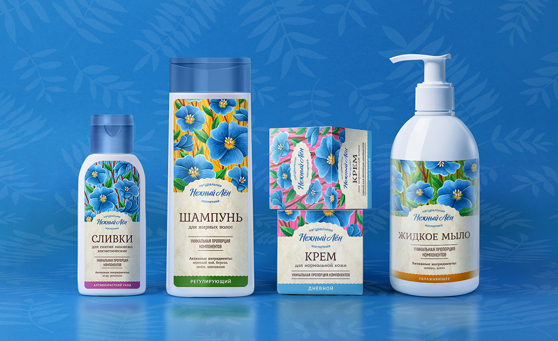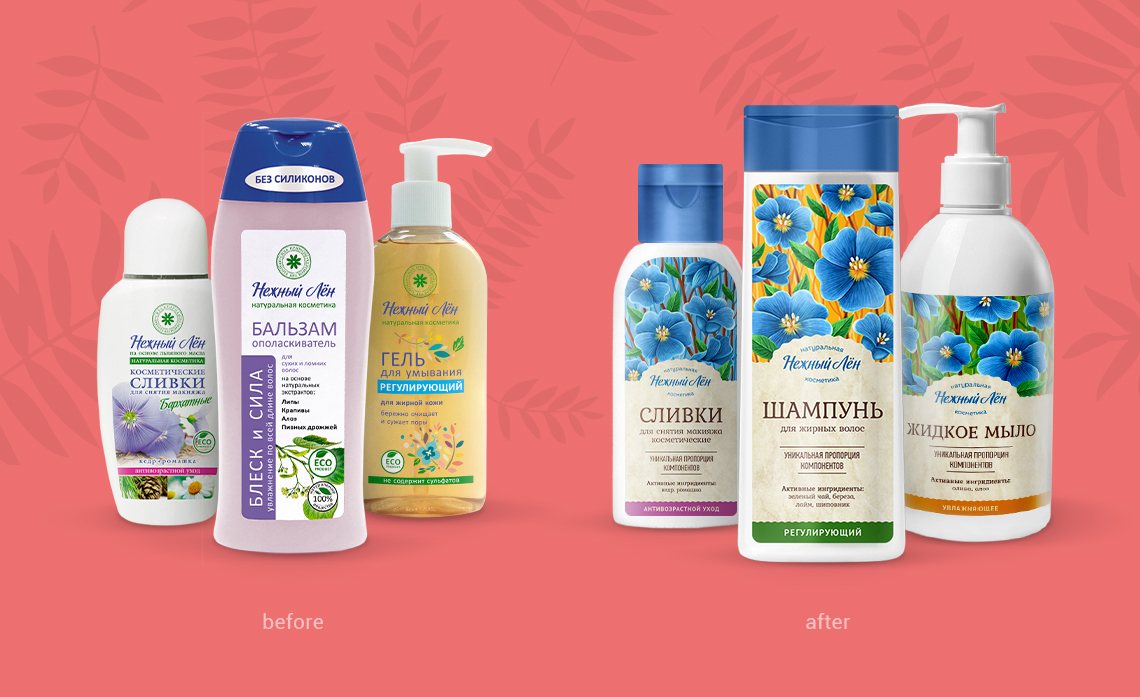 В основе новой концепции главным идентификатором бренда является иллюстрация цветков льна, выполненная в стиле ручной графики. В зависимости от продукции внутри линейки, цвет фона изменяется, сохраняя общий стиль. На подложке расположен основной текстовый блок, в котором описывается основной состав продукции. В конечном итоге, новая концепция дизайна стала выглядеть натурально и экологично.