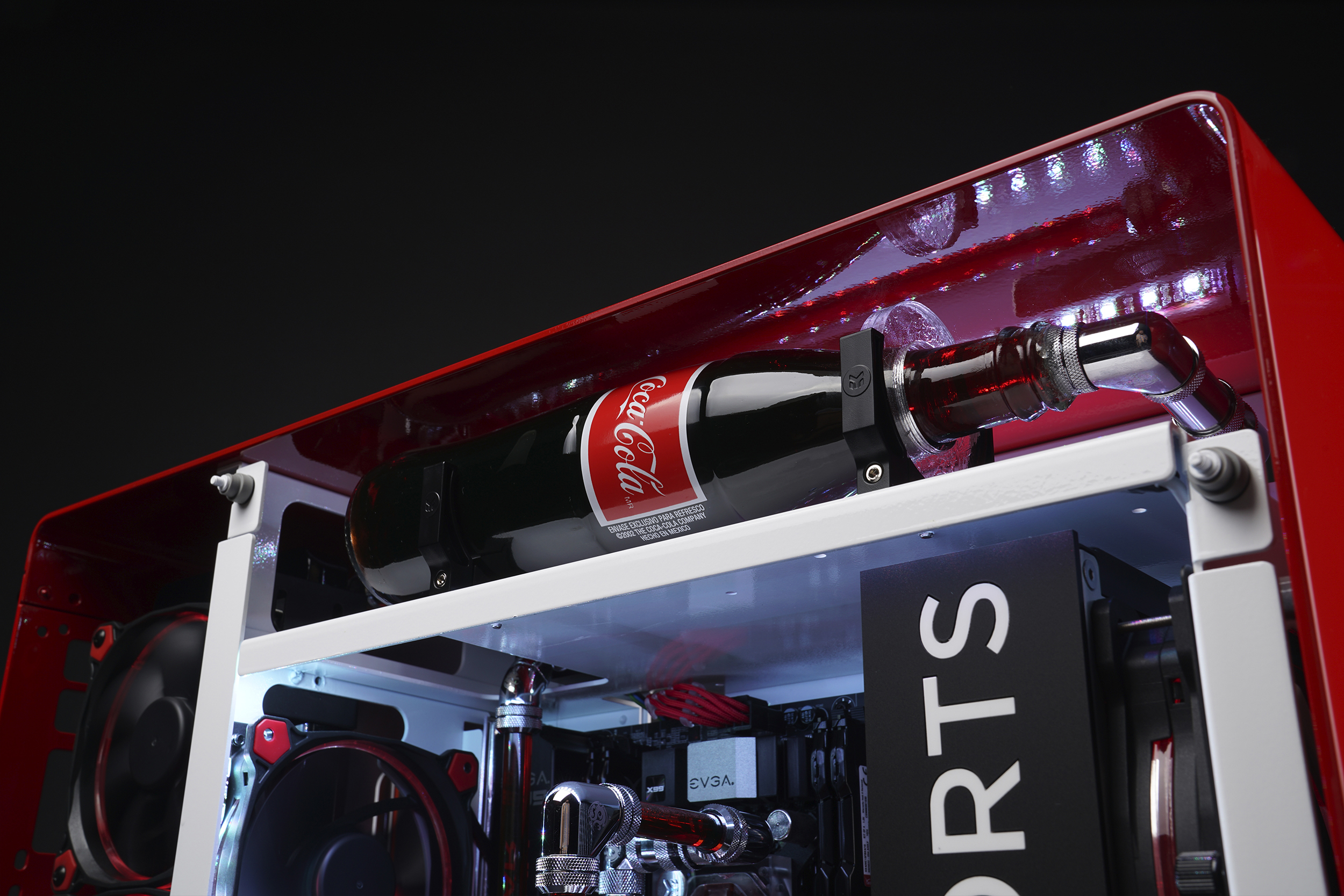 Компьютер MAINGEAR Rush 1ofONE Coke Esports был создан компанией Coca-Cola и производителем игровых компьютеров Maingear. Продукт стал удивительным сочетанием функциональности и великолепия. В конструкции даже использована настоящая стеклянная бутылка Coke, хотя внутри неё, конечно, находится не газировка. Это особая жидкость для охлаждения, которая предотвращает перегрев деталей.