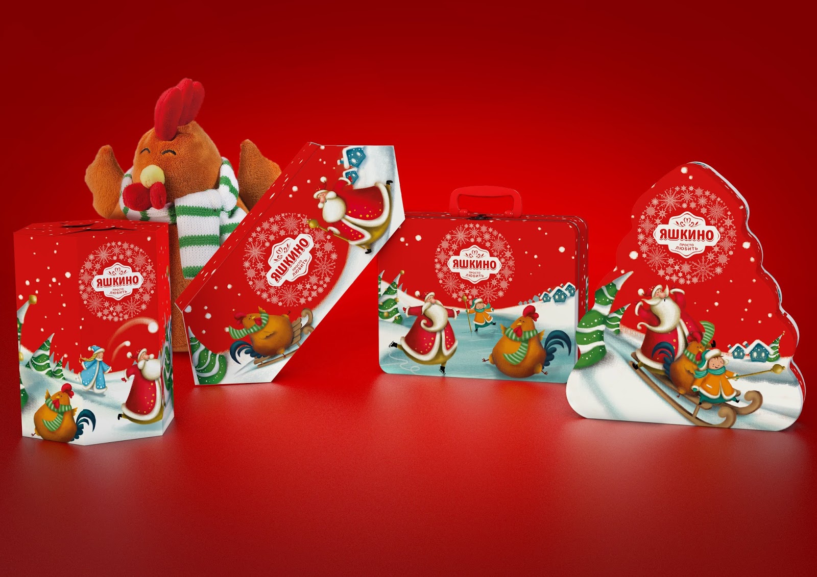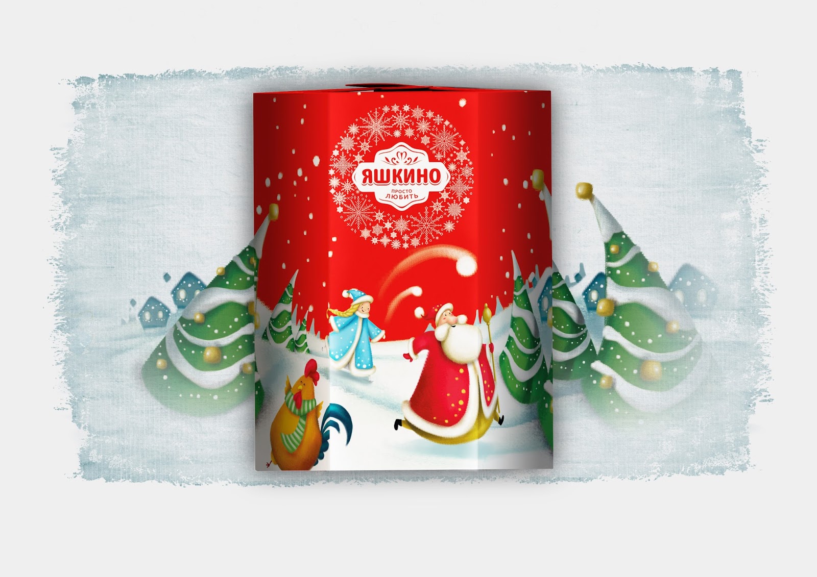 «Яшкино» является одним из важнейших брендов в портфолио KDV‐Групп — российского производителя снеков и кондитерских изделий, которому принадлежит 17 брендов и 350 продуктов. В преддверии новогодних праздников бренду «Яшкино» потребовалась лимитированная серия подарочных упаковок. Линейка ориентирована на детей, а значит, должна выделяться тематической упаковкой, которая не затеряется среди огромного количества подарочных наборов конфет, представленных на прилавках российских магазинов в это время года.