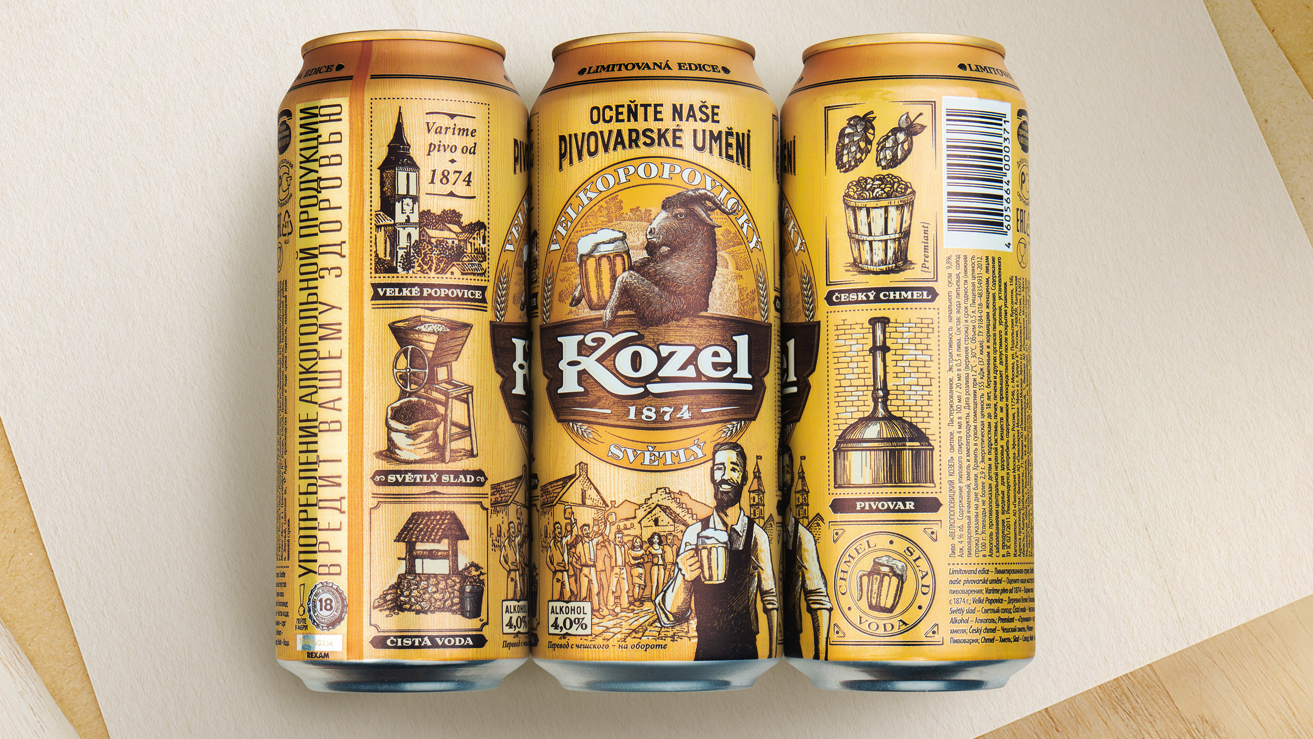 В результате работы был создан дизайн, передающий душевную атмосферу чешской деревушки Велке Поповице, родины пива Kozel, где с любовью и знанием дела подходят к процессу пивоварения, о котором и рассказывает серия небольших иллюстраций, размещенных на боковых частях банки и поддержанных комментариями на чешском языке.