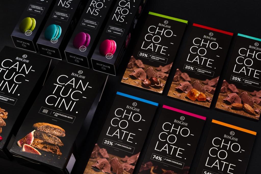 Компания Fabula Branding разработала дизайн упаковки шоколада для BonGenie. Дизайн данной линейки реализован в общей премиальной стилистике марки, разработанной и воплощенной еще в линейках пирожных «макарон» ручной работы и тосканских сухариках, — черный цвет, крупная типографика и сочный фотостиль.