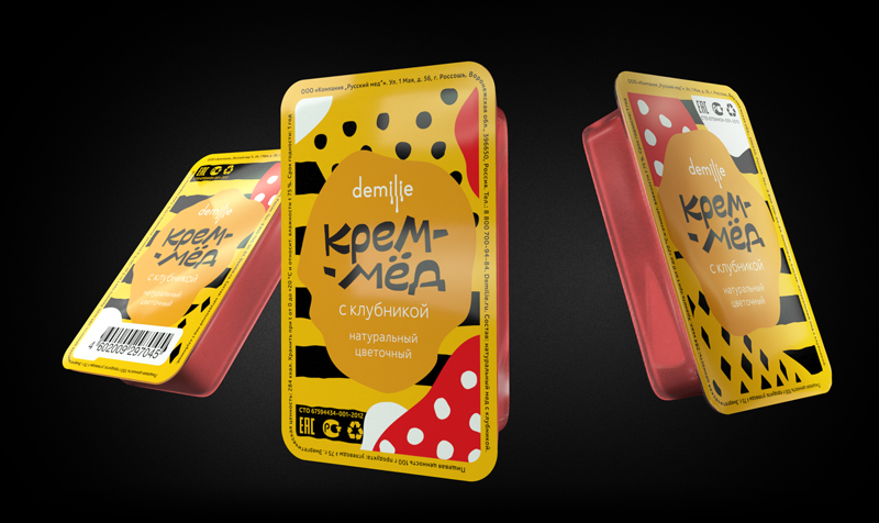 В студии также оформили банки для меда «Демилье», порционные блистеры и демонстрационные коробки для магазинов. Банки оформляются фирменным черно-желтым паттерном. Упаковка меда с добавками дополняется красочными абстрактными элементами других цветов — для каждого вкуса подобрана соответствующая палитра. На крышке размещается иллюстрация добавки или медоносного растения, из нектара которого получен десерт. Сквозь прозрачные окошки на упаковке виден сам крем-мед. Натуральный крем-мед без добавок раскладывается по черно-желтым банкам без дополнительных цветов.