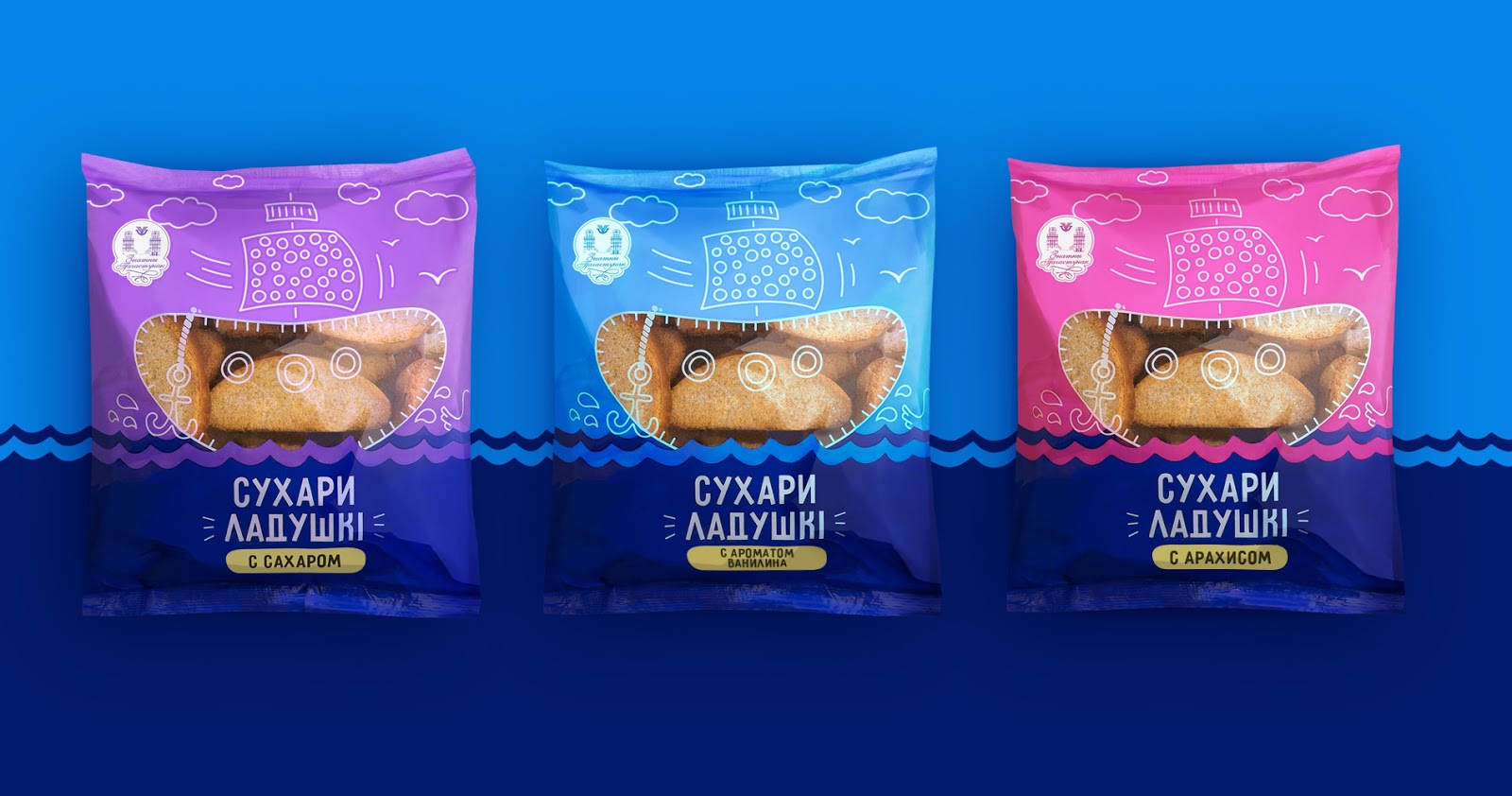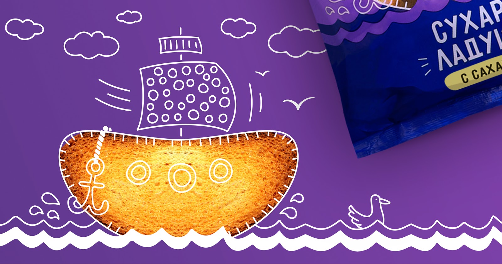 В серии упаковок с сухарями основным визуальным элементом дизайна был выбран непосредственно сам продукт — сухарик. Его узнаваемая форма стала не только «окошком» вырубки, но и придала упаковке уникальное сюжетное решение. Цвета подобраны нарочито яркие и активные, чтобы усилить эффект мультипликационной истории для каждого вкуса и аромата. А форма сухарика в данном решении всякий раз становится центральным элементом сюжета. Такой подход позволяет рассказать целую историю для каждого SKU.