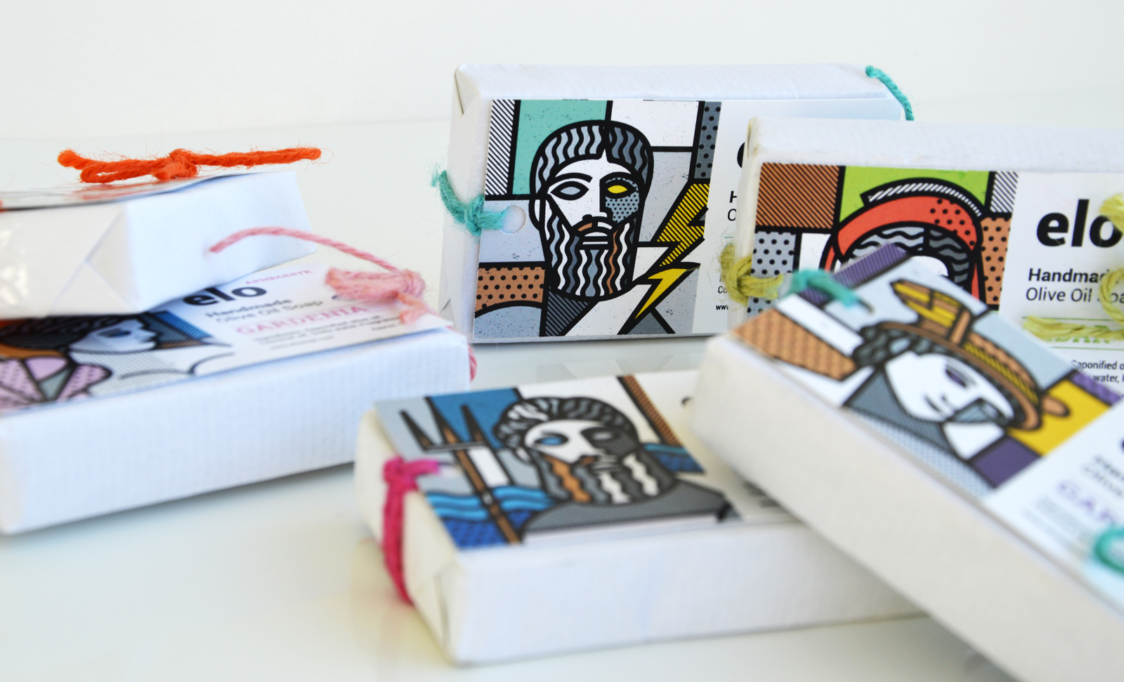 Мыло Elo — это полностью натуральный продукт ручной работы, изготовленный из натурального греческого оливкового масла. Компания Elo Soaps обратилась к дизайнеру с просьбой создать серию иллюстраций для мифологических богов и богинь Греции, чтобы оформить упаковки с мылом, которые реализуются в сувенирных магазинах Греции. Такой продукт покупается преимущественно туристами.