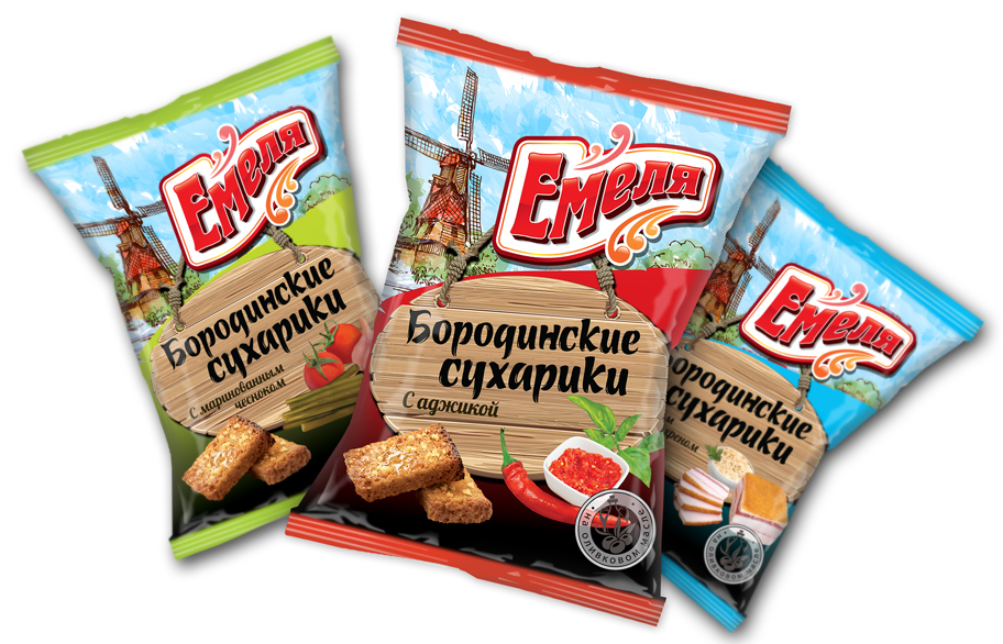 Общая иллюстрация, объединяющая всю линейку — изображение мельницы на фоне неба. Логотип «Бородинские сухарики» размещен на доске-вывеске. В линейку входят 8 SKU, разделенные на различные вкусы.