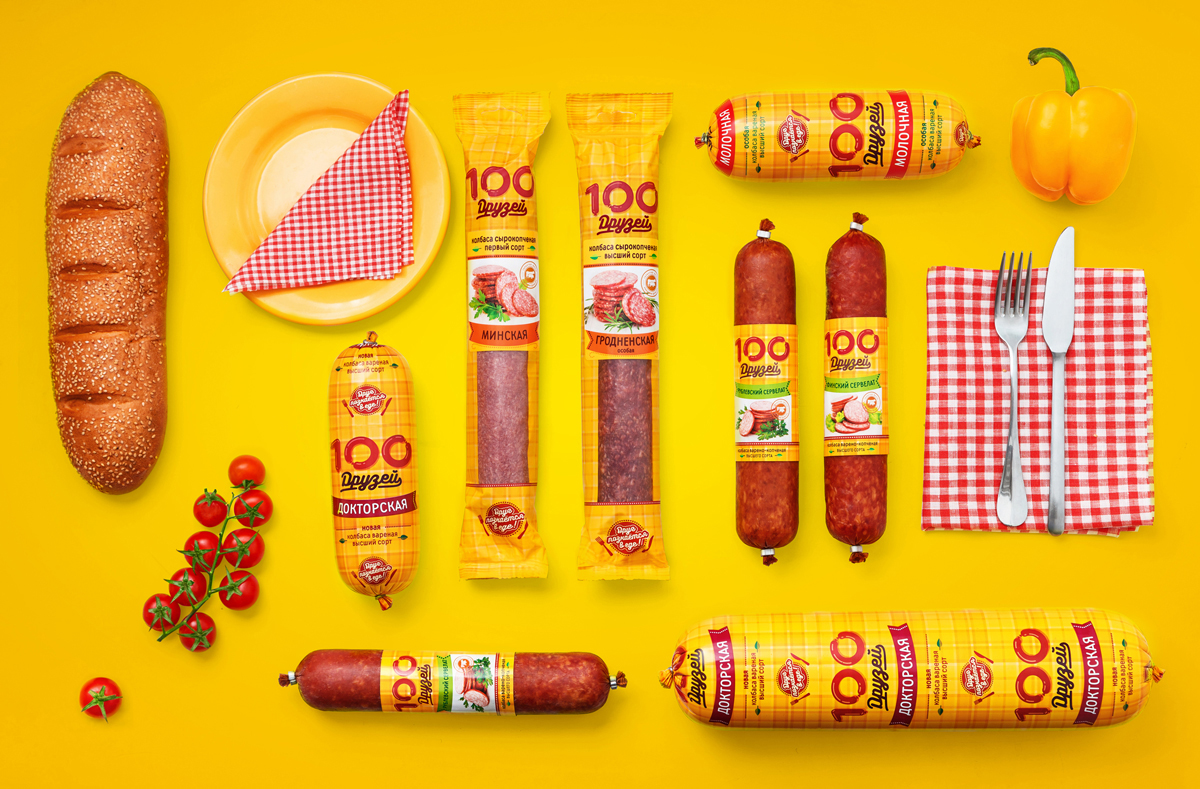 Агентство Fabula Branding провело комплексную разработку торговой марки колбасных изделий «100 друзей» (нейминг, логотип, дизайн упаковки) для ОАО «Гродненский мясокомбинат».