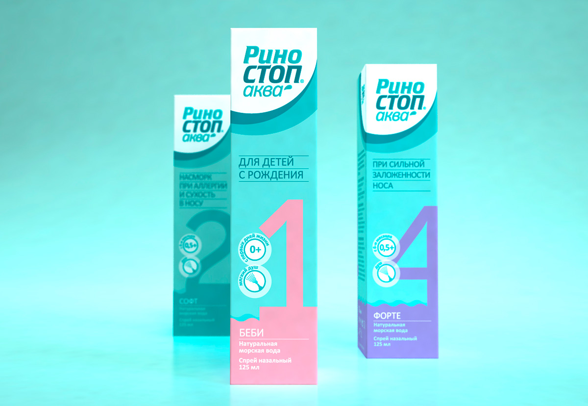 ASGARD Branding для фармацевтической компании OTC Pharm разработал упаковку лекарственных препаратов «Риностоп Аква». Линейка включает четыре позиции: «Риностоп Аква Беби» спрей 125 мл, «Риностоп Аква Софт» спрей 50 мл и 125 мл, «Риностоп Аква Норм» спрей 125 мл, «Риностоп Аква Форте» спрей 50 мл и 125 мл.