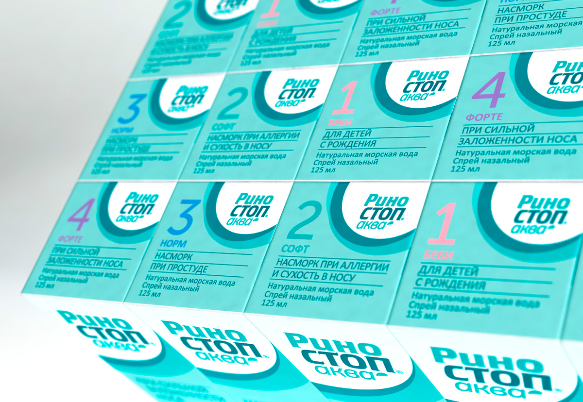 Для дифференциации внутри линейки было предложено использовать нумерацию продуктов. Основным изобразительным элементом стали крупные цифры. Для большего различия, дизайнерами была предложена цветовая кодировка, позволяющая потребителю без труда найти необходимый препарат. Также произведена коррекция логотипа и оформления бренд-зоны. Для новой линейки предложен свой свежий фирменный цвет, выделивший «Риностоп Аква» на фоне общей группы «Риностоп».