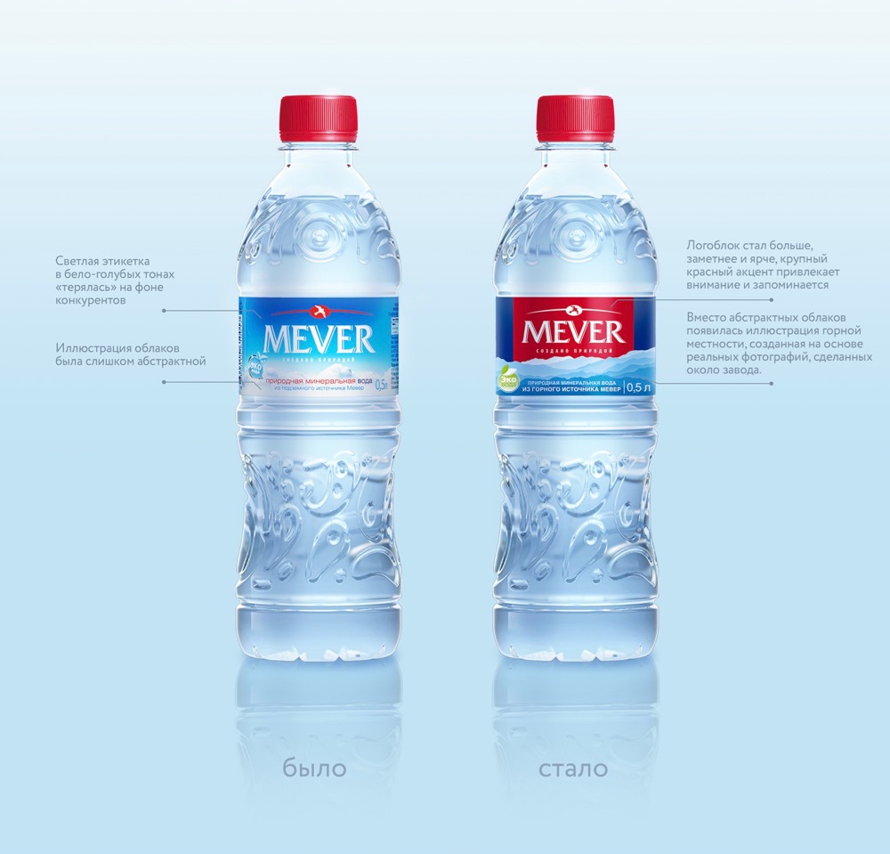 Бренд-команда «Рычал-Су» обратилась в Depot WPF c задачей по редизайну, целью которого было выделить MEVER на фоне конкурентов и увеличить видимость бренда на полках супермаркетов. Кроме того, требовалось уменьшить градус абстрактности в дизайне бутылки: облака, изображенные на старой этикетке, не вызывали у потребителей нужных ассоциаций. При этом новая бутылка должна была сохранить преемственность предыдущему дизайну — лаконичному и «чистому», с интересным декоративным конгревом, создающим цельный визуально-тактильный образ.
