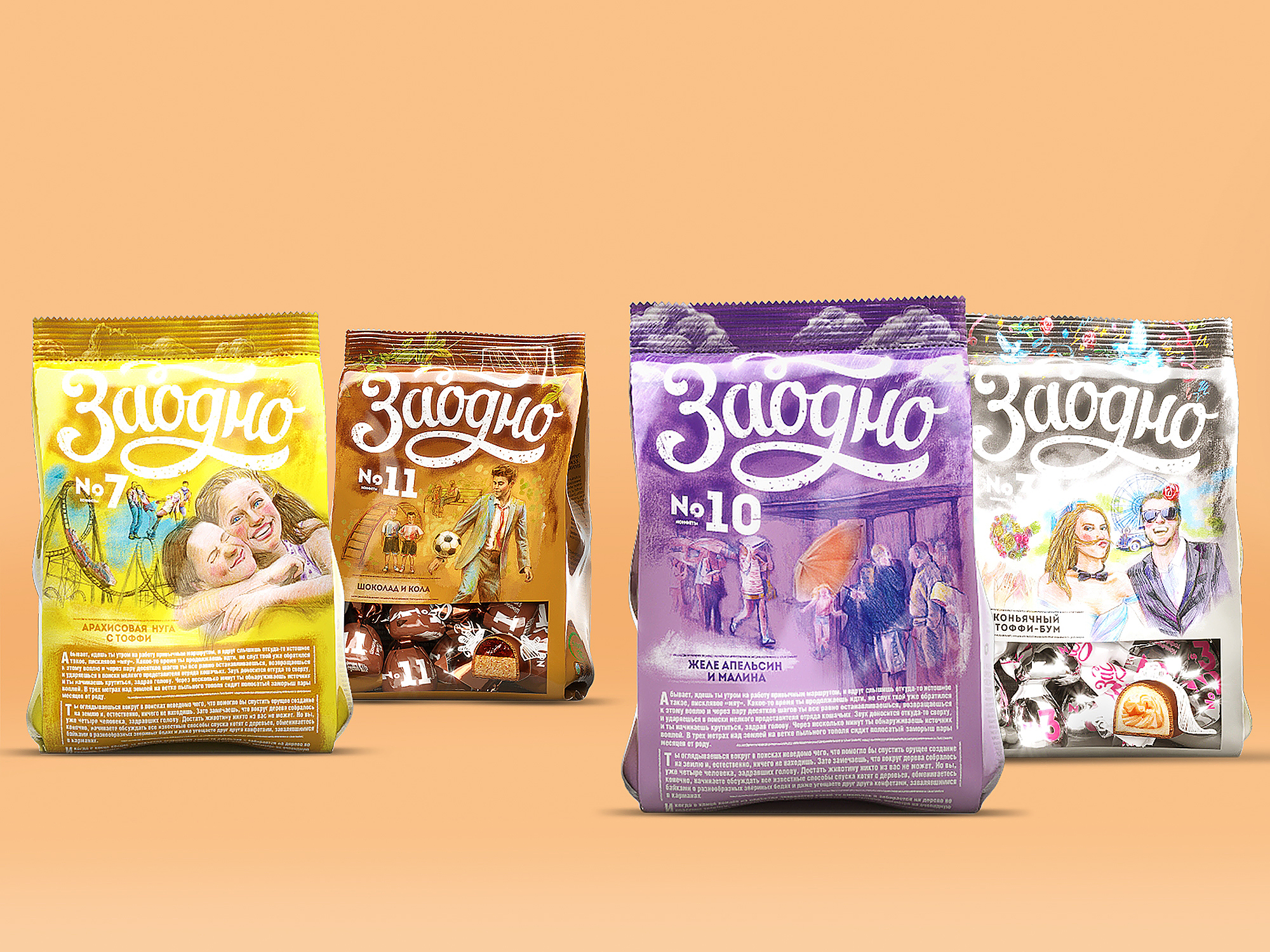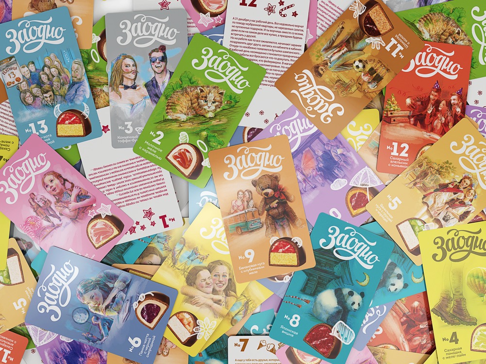 «Связать всё — в этом была одна из самых сложных, но и самых интересных задач бренда. Номер, вкус конфеты, иллюстрация, история, цветовое решение упаковки, даже маленькие детали на конфетах — абсолютно все элементы создают уникальный, позитивный образ», — говорит Юлия Пальчикова. — Красота в деталях — а этих деталей так много, что трудно перечислить. Например, если приглядеться, на «Заодно №12» можно увидеть надпись «СПИСОК МЕЧТ» на лежащей на столе папке. А «Заодно №13» — SKU, которая планируется к выпуску в дальнейшем, — превращает пятницу, тринадцатое, в замечательный день вопреки суевериям. Когда смотришь на иллюстрации, читаешь эти маленькие, добрые истории, то невольно твое лицо озаряет улыбка».