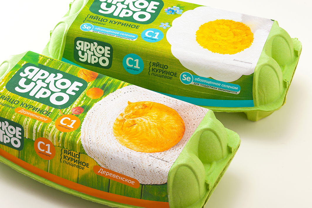Какой продукт представлен под брендом «Яркое утро», должно быть видно издалека. Но, когда покупатель берет в руки упаковку, он видит не то, что ожидал (куриные яйца), а сюжеты-ассоциации, которые вызывают у потребителя образы яркого утра.