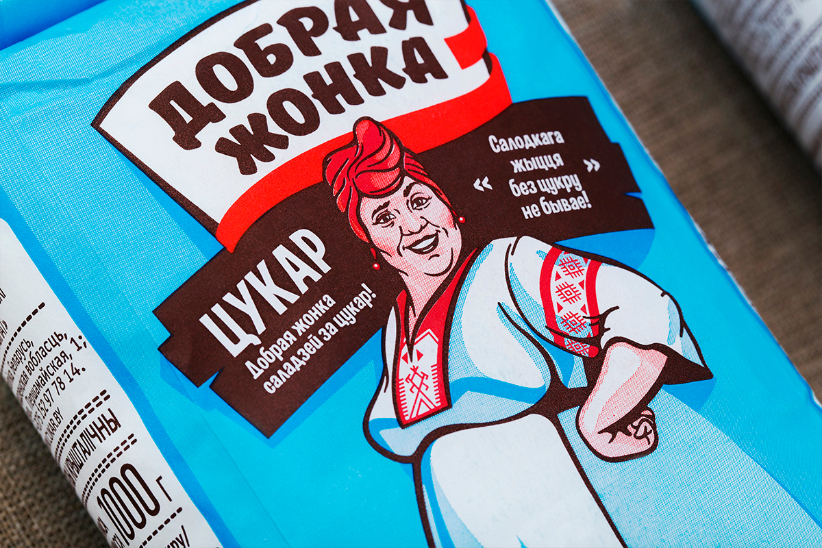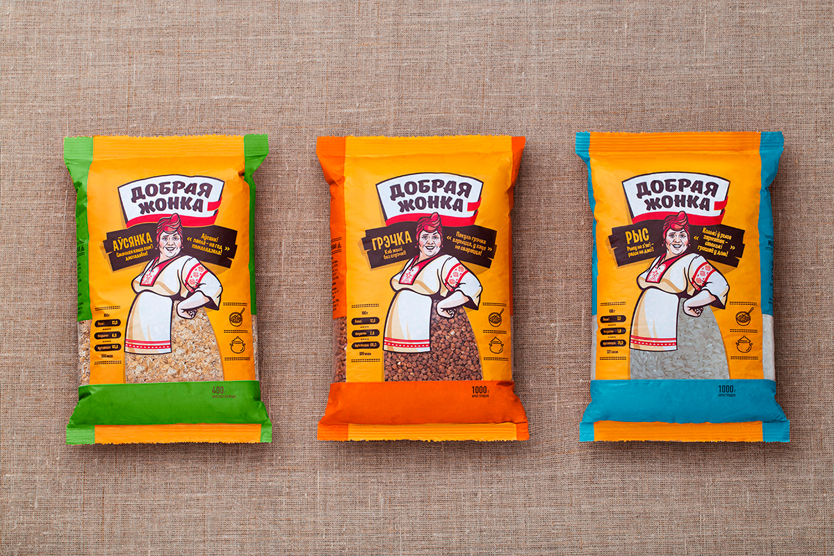 Решением стала национально ориентированная торговая марка «Добрая жонка» (Хорошая жена), выделяющаяся также своей эмоциональностью. Белорусскоязычный нейм, визуально воплощенный в крупном шрифтовом логотипе, колоритный бренд-персонаж, ставший композиционным центром дизайна, — все элементы способствуют эффективной отстройке продукта от конкурентов. Располагающий к себе юмористический образ бойкой, деловитой хозяйки привлекает внимание, повышает лояльность покупателей.