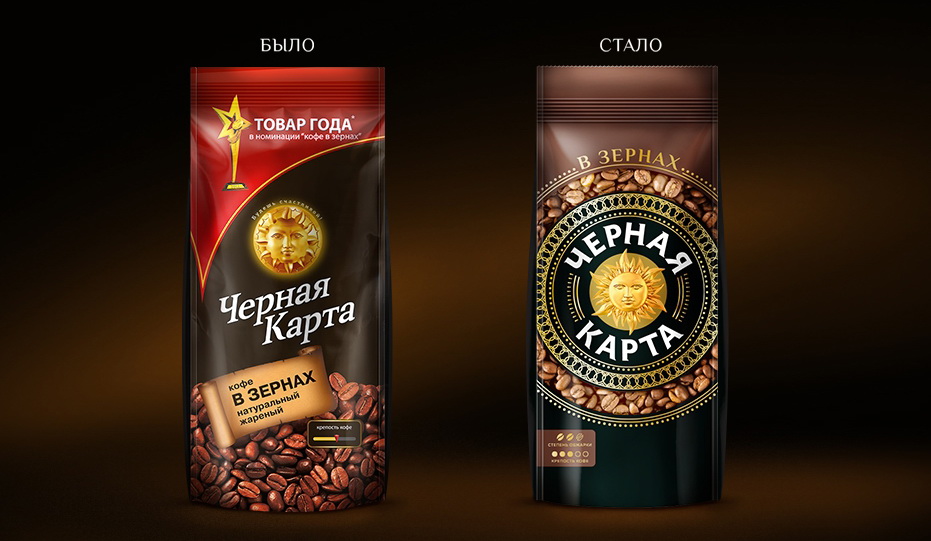 Логотип стал доминантой в дизайне упаковки и основным стилеобразующим элементом, также формирующим единый бренд-блок на полке. Для упрощения поиска по виду и помолу кофе разработаны системы цветового кодирования и основных характеристик продукта по степени крепости и обжарки, информация о способе приготовления вынесена на отдельную плашку в верхней части упаковки.