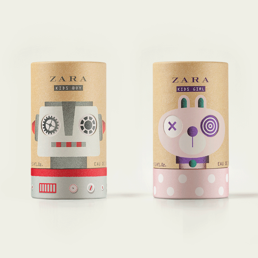 Zara Kids — это аромат для детей возрастом от 3 до 14 лет. Дизайнеров из испанского агентства Lavernia & Cienfuegos попросили разработать две иллюстрации или двух персонажей, которые были бы привлекательны и забавны, и разговаривали с детьми на понятном их визуальном языке. Кроме того, персонажи должны были дифференцировать парфюмерию для мальчиков и девочек. В результате дизайнеры придумали кролика и робота в соответствующей цветовой палитре, что позволило выполнить все эти требования.