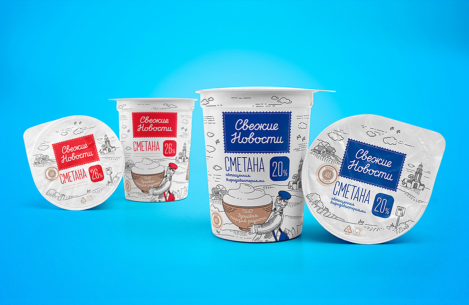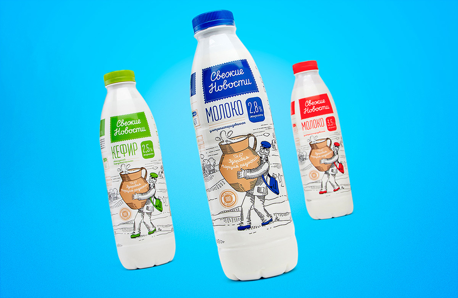 В центре авторской иллюстрации — почтальон, который вместе со свежей прессой несет огромный кувшин с продуктом. Рукописный шрифт, информационные значки, обыгрывающие почтовую тематику, и дружелюбный персонаж вызывают улыбку и настраивают на позитивное восприятие продукта.