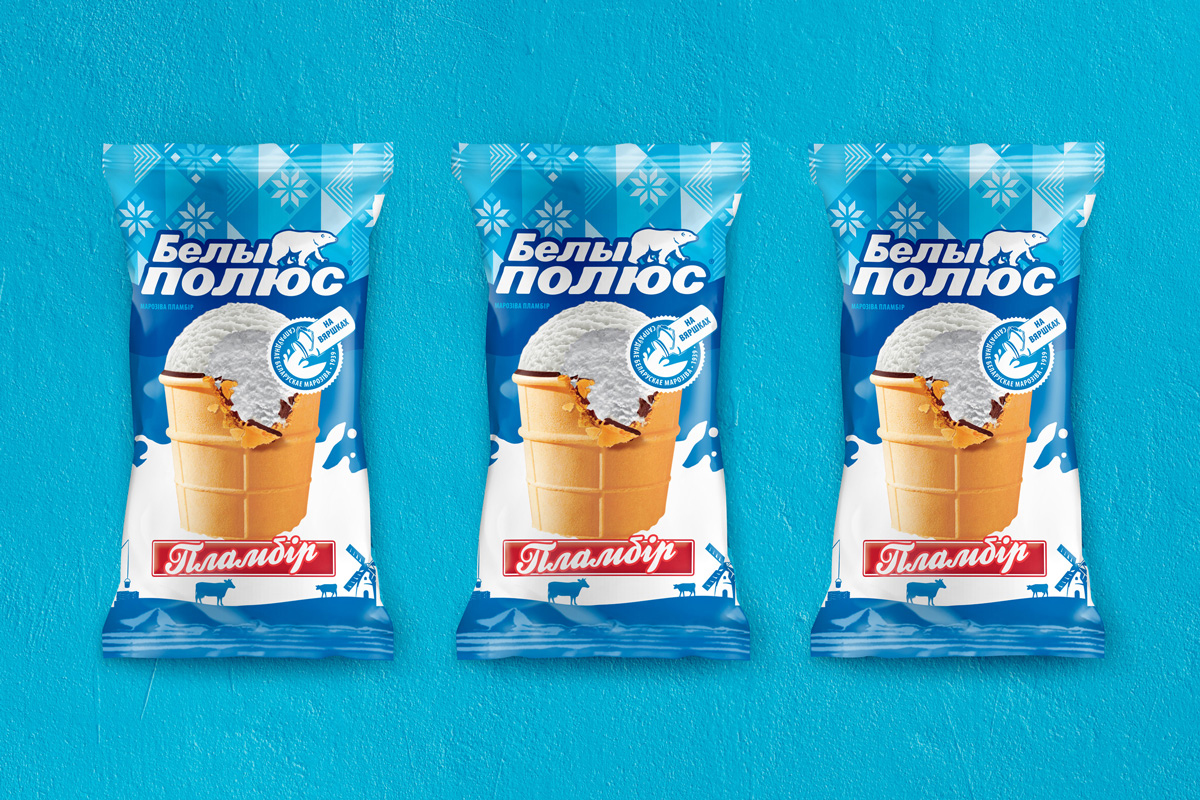 Стилеобразующей доминантой дизайна стал яркий контрастный паттерн с использованием символа снежинки, которая также напоминает элемент национального белорусского орнамента. Это позволило не только сделать торговую марку близкой и понятной белорусам, но и увеличило узнаваемость бренда: вызывая ассоциации со снегом, льдом, севером, снежный паттерн поддерживает нейм «Белы полюс», а также помогает заявить товарную категорию (мороженое), способствуя быстрой идентификации продукта потребителем.